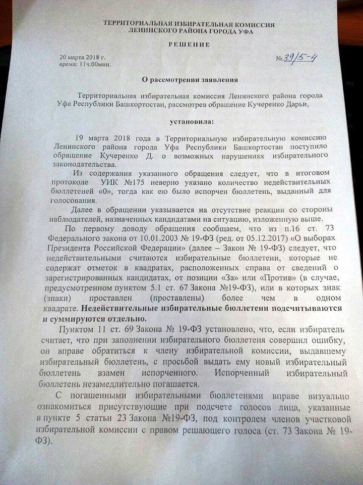Я в ящик ЦИКа жалобу опустила 20 марта в 10.30 где-то. И в 17.00 в ЦИКе заверяли, что к ним ничего не поступало. Как ТИК так быстро успел ее получить и рассмотреть?