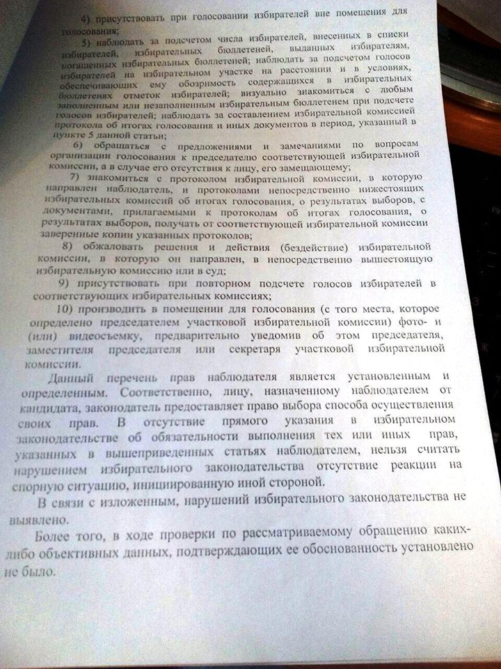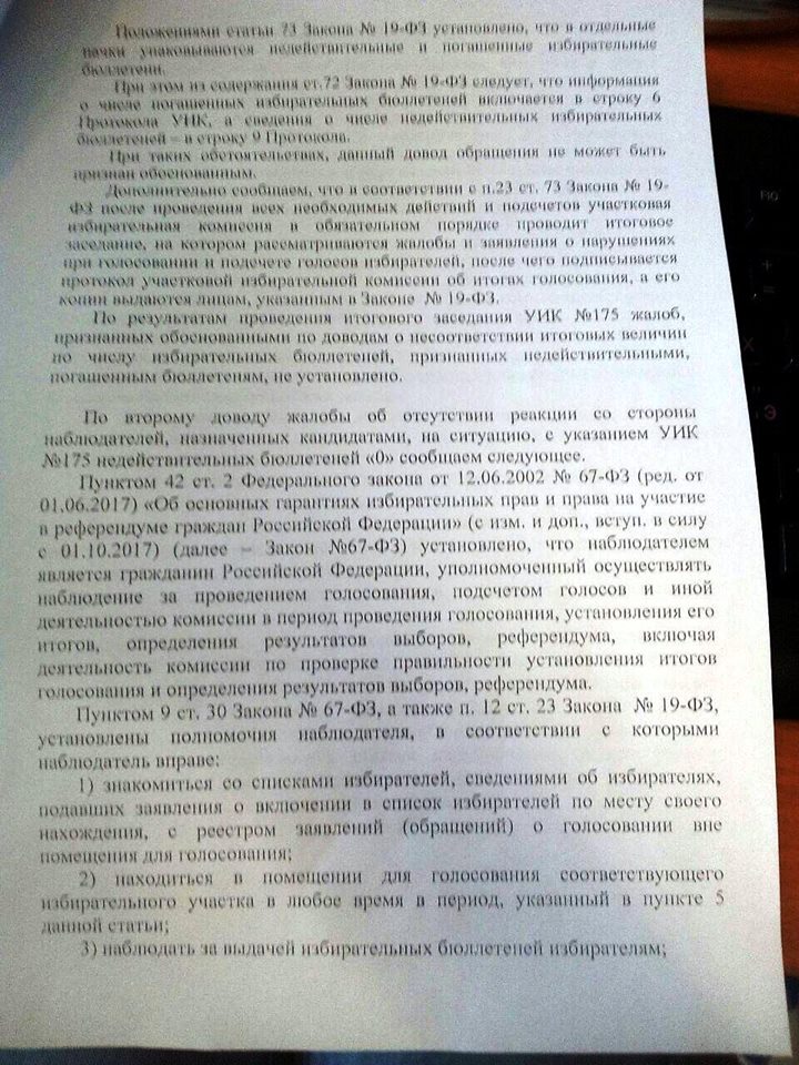 Затем, что «по второму доводу жалобы об отсутствии реакции со стороны наблюдателей сообщаем следующее». Я вообще об этом ничего не писала. Откуда они взяли про мое недовольство отсутствием реакции наблюдателей, я не знаю.