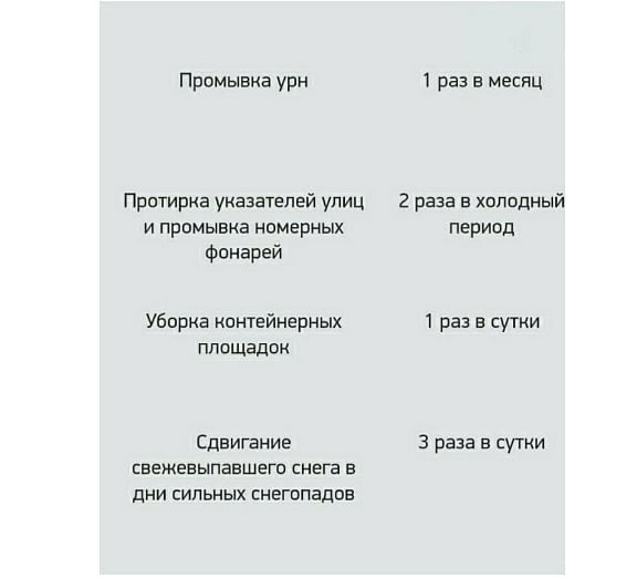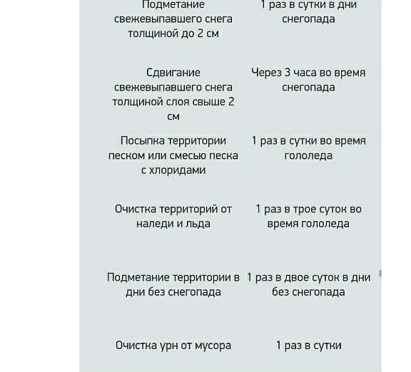 Во время снегопадов придомовая территория должна убираться не реже одного раза в сутки при толщине снега до двух сантиметров, при большей толщине снега — с периодичностью от одного часа до трёх часов, в зависимости от класса тротуаров (приложение №1 Приказа Госстроя № 139 от 9 декабря 1999 года, пункт 3.6.14 «Правил и норм технической эксплуатации жилищного фонда», утвержденных Постановлением Госстроя РФ от 27.09.2003 года № 170). 3.6.2. Места, недопустимые для уборочных машин, должны убираться вручную до начала работы машин, с труднодоступных мест допускается подавать снег на полосу, убираемую машинами.