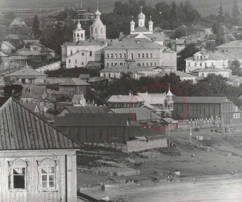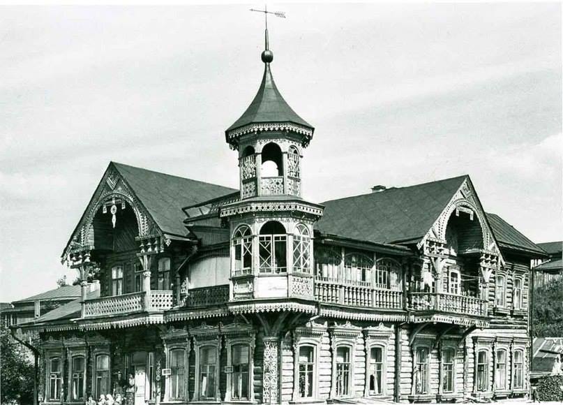 «Ах, какой это был дом!.. Весь деревянный (только лестница белокаменная), бревенчатый, с дивно вырезанными орнаментами наличников, карнизов и балкончиков, с крутой крышей и флюгером на ней, с островерхими ажурными башенками, он как бы стремился к небесам и походил на остановившееся пламя…».