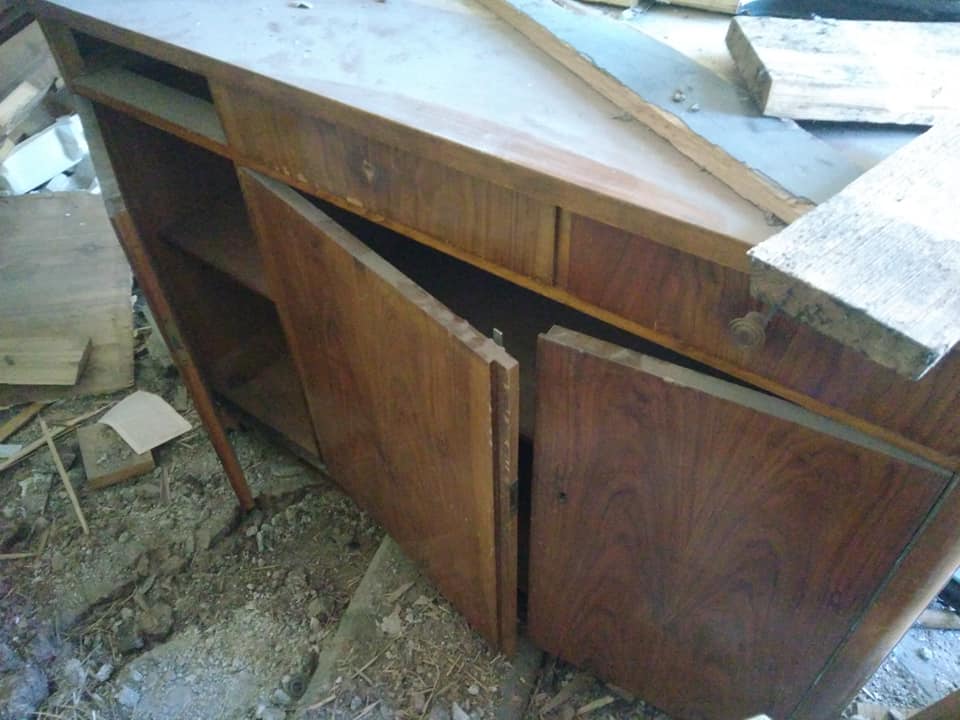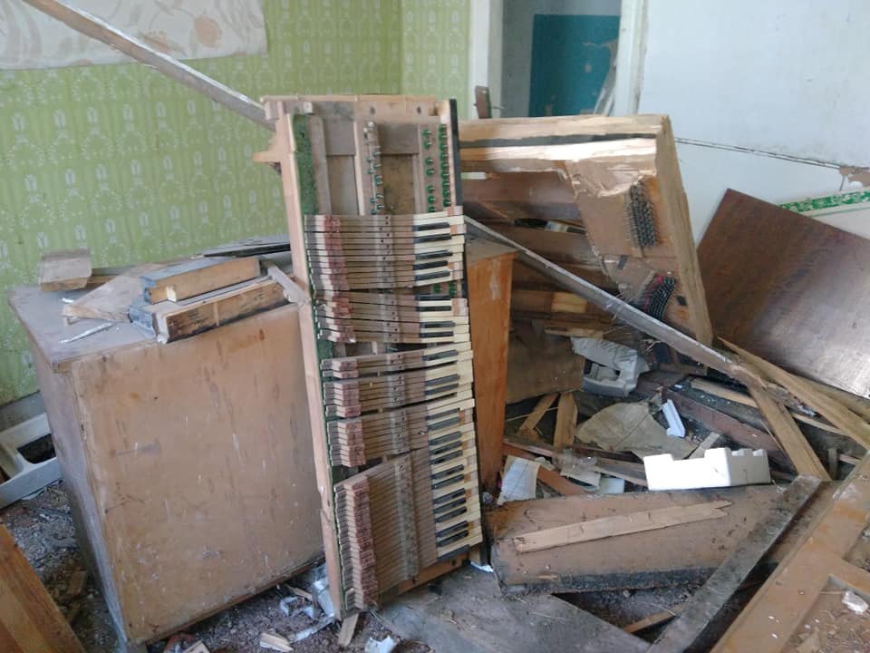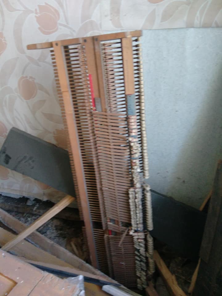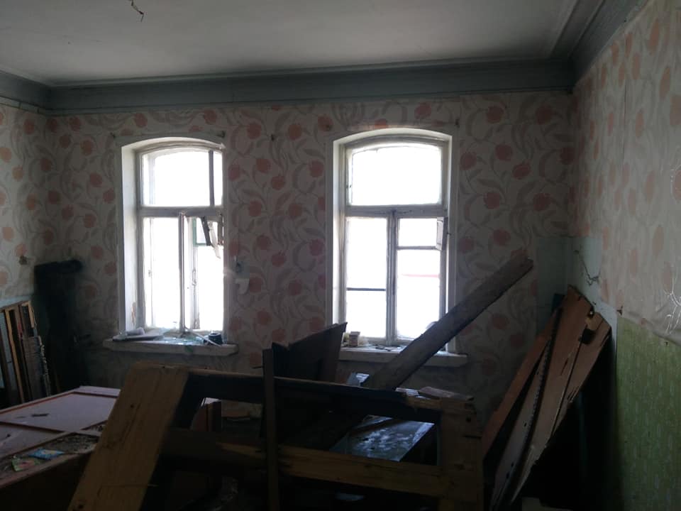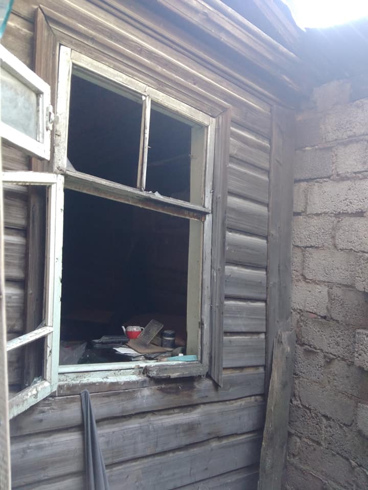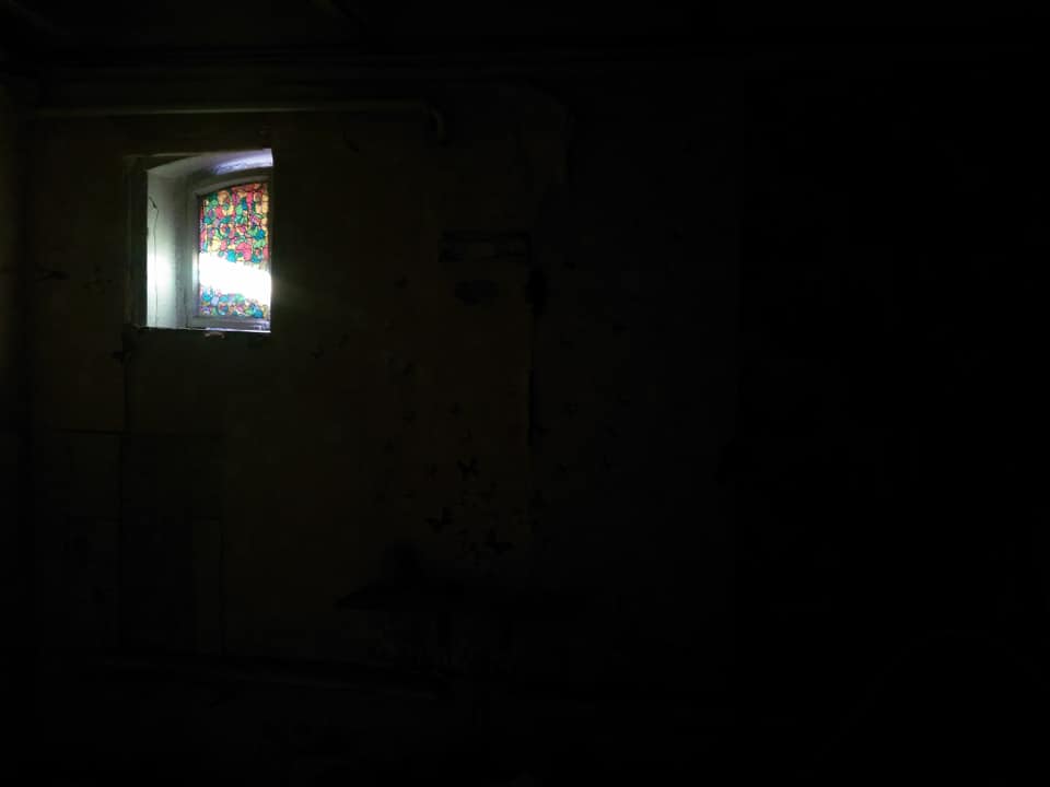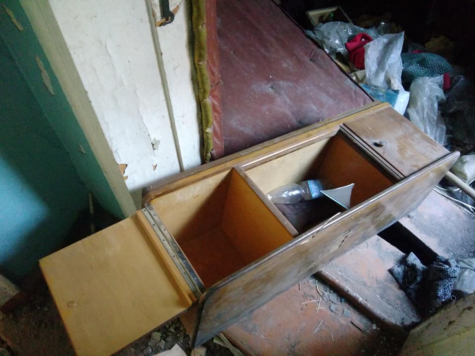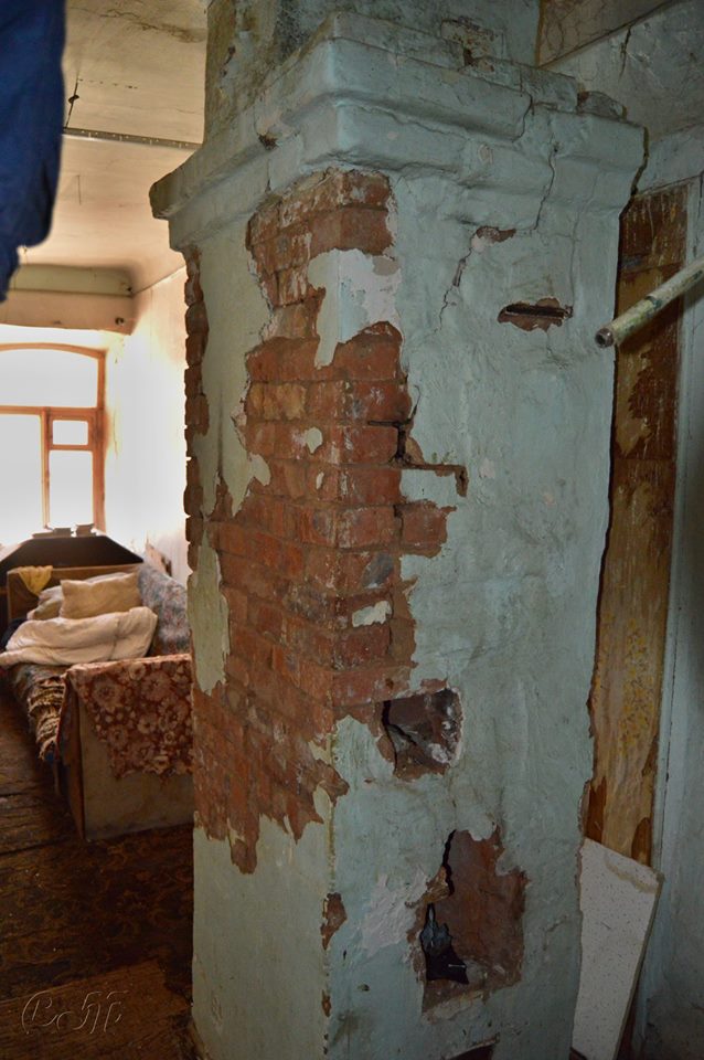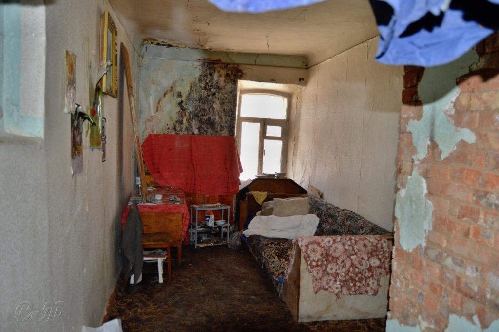А в этой комнате поселился бомж и по-своему навел уют и красоту в жилище. Пока я снимал, за спиной раздались шаги и в дом вошел пьяненький мужик с добычей: в большой банке из-под майонеза плескалось какое-то тошнотворное месиво с кусочками хлеба.
