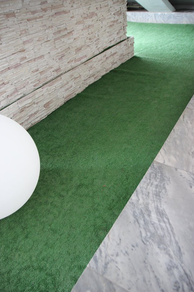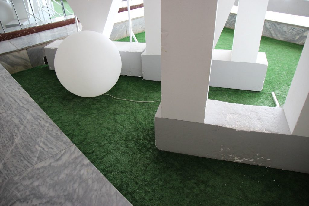 Так вот. В фойе дворца есть небольшой бассейн, пол которого выложен чудесной мозаикой. И что я вижу в эту субботу — в бассейне уже красуется этот искусственный газончик с кичевым артобъектом в придачу (буквы УМПО для селфи).