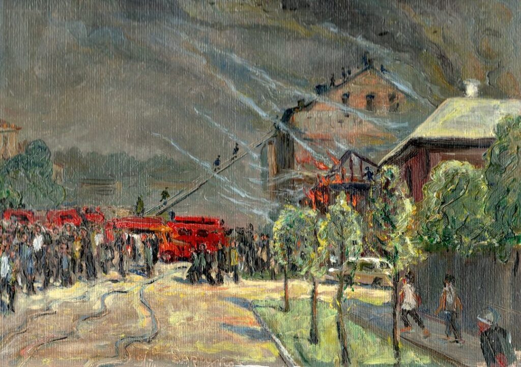 Горела обувная фабрика имени Ворошилова. Сейчас это, уцелевшее тогда, здание входит в комплекс «Арт-Квадрата». Уфимский художник и строитель Алексей Барсуков 9 июля 1963-го, сидя в кабине самосвала, выставленного как часть оцепления, написал этюд с этого пожара. Собственно, он перед вами. Кроме того, на обороте Барсуков оставил несколько заметок об этом событии. Пожар длился 4 часа. Возгорание случилось на складе кирзовых сапог, их стоимость оценили в 2-3 миллиона рублей. Бежевая легковушка в правой части картины — машина первого секретаря обкома КПСС Зии Нуриева. Два деревянных дома, также в правой части рисунка, в итоге тоже сгорели, уже дотла.