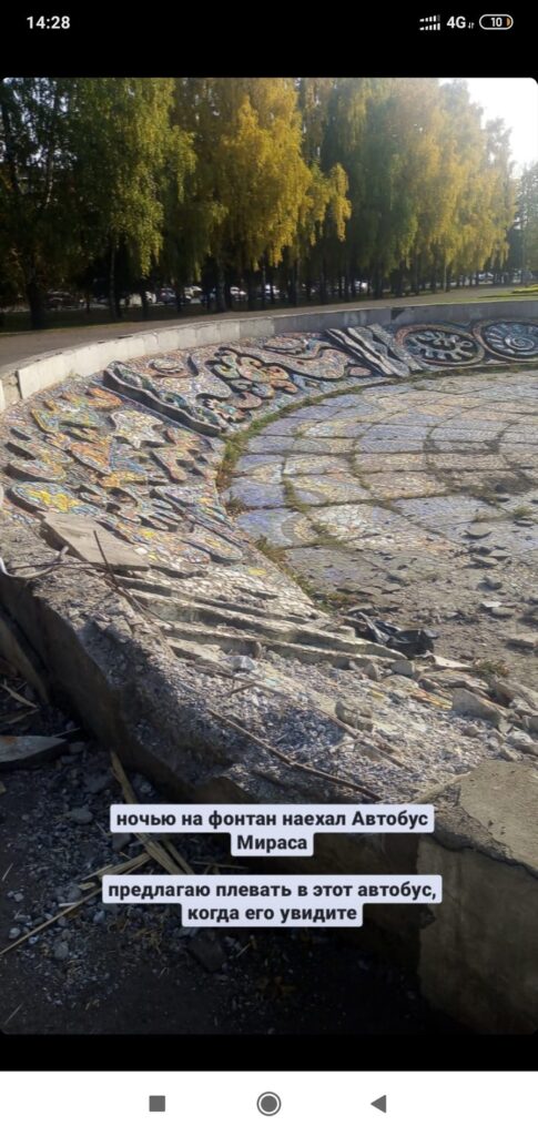 В Черниковке есть прекрасный фонтан возле ДК «Химик», его чаша украшена мозаикой, которых вообще мало осталось в городе — тем более в сочетани с фонтаном. Она неплохо сохранилось, нужно лишь подправить бетонные бортики. И запустить механизм, конечно, возможно, он за годы простоя заржавел совсем. Я очень опасаюсь, что фонтан для реставрации, которая уже заявлена в СМИ, отдадут местным швондерам из ЖЭУ. А еще что фонтан не доживет до лучших времен, потому что сегодня ночью, например, на него наехал автобус ансамбля «Мирас». Разрушения на фото, которое мне прислали граждане.