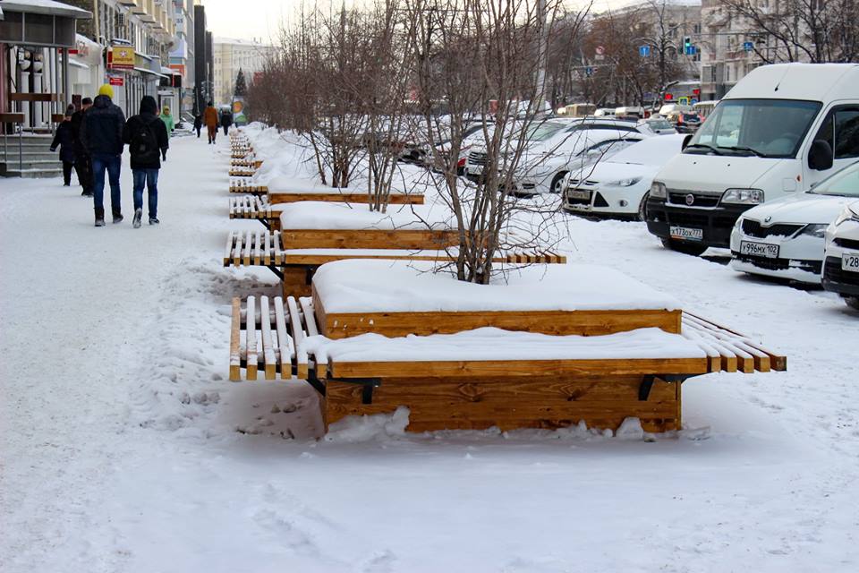 Вот такая красота открылась моим очам позитивного уфимца (фото 1). Ряд скамеек до самого горизонта (в конце прячется семья с одинаковыми лицами, но это не так позитивно). Как видите, скамейки не просто так занимают место, вот-вот придут дворники, аккуратно сметут снег и уже через 30 минут на скамейках будут сидеть уфимцы, так и будет, вангую!