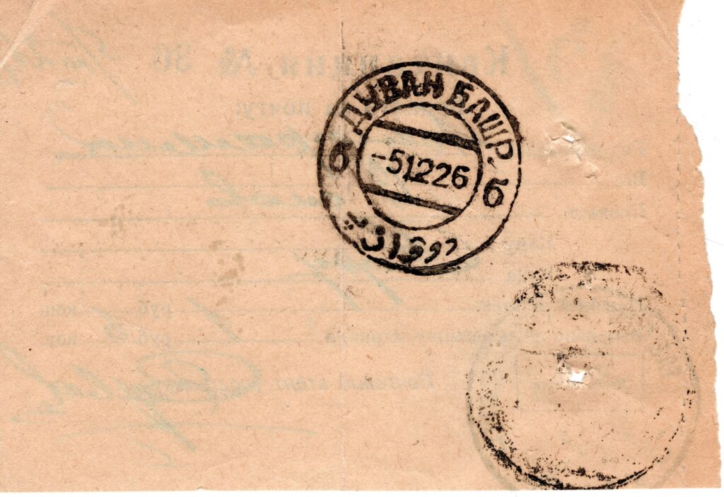Это квитанция о приёме телеграммы в 13 слов от 5 декабря 1926 года. Квитанция примечательна двумя нашими двуязычными почтовыми штемпелями — Месягутово и Дувана. Месягутовский штемпель любопытен рисунком с гербом и связистской эмблемой. Это большая редкость, ни разу не видел такого, тем более на штемпеле с арабицей. Ну, и дуванский штемпель — замечательного качества. На века отпечатали.