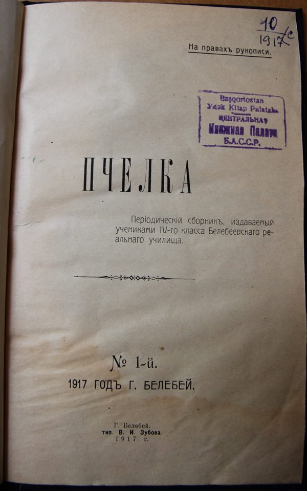 В Книжной палате РБ мне удалось найти первый номер (и, вероятно, он стал и единственным) периодического сборника «Пчелка», подготовленного учениками IV класса Белебеевского реального училища.