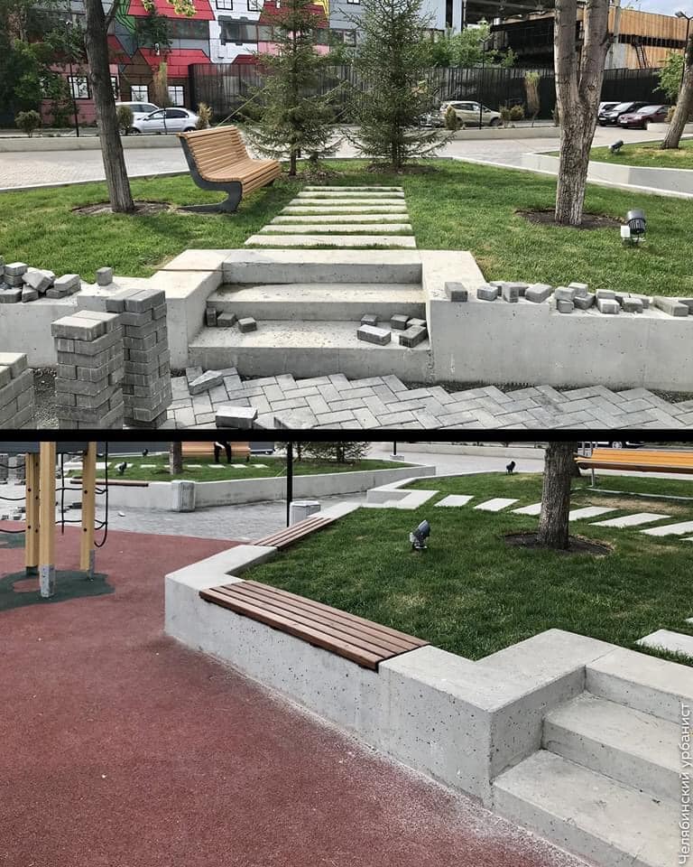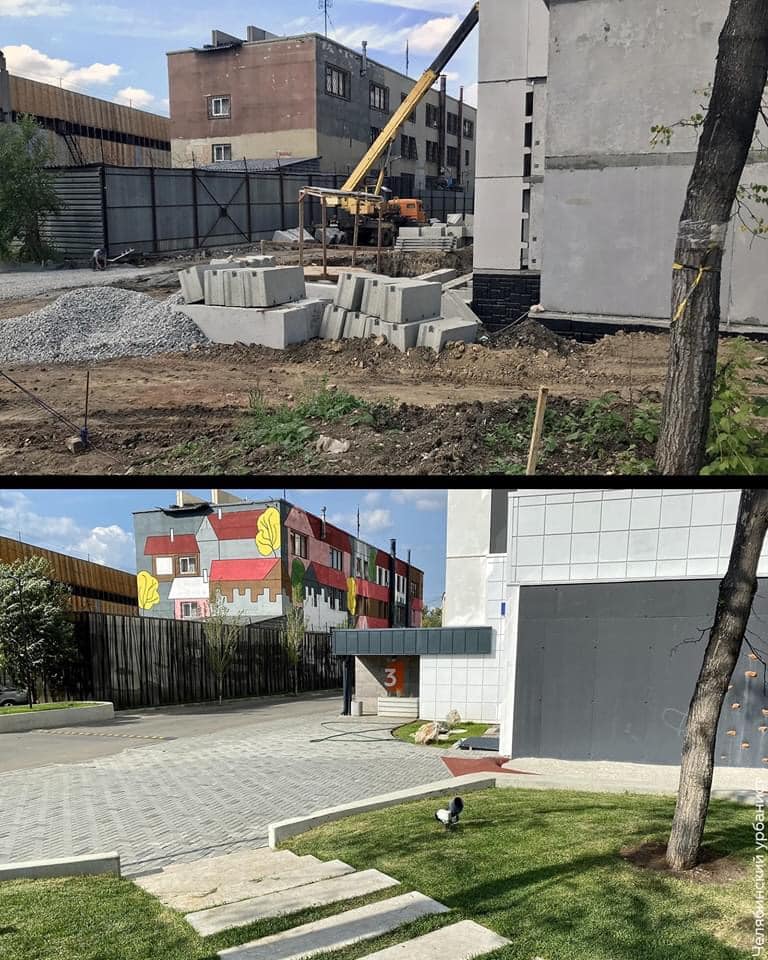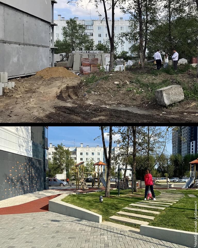 И ещё один пример благоустройства двора очень приглянулся, который прислал Артур Рахметов, из Челябинска. Когда и бетон применялся только по назначению, и деревья все сохранены, и вообще со вкусом.