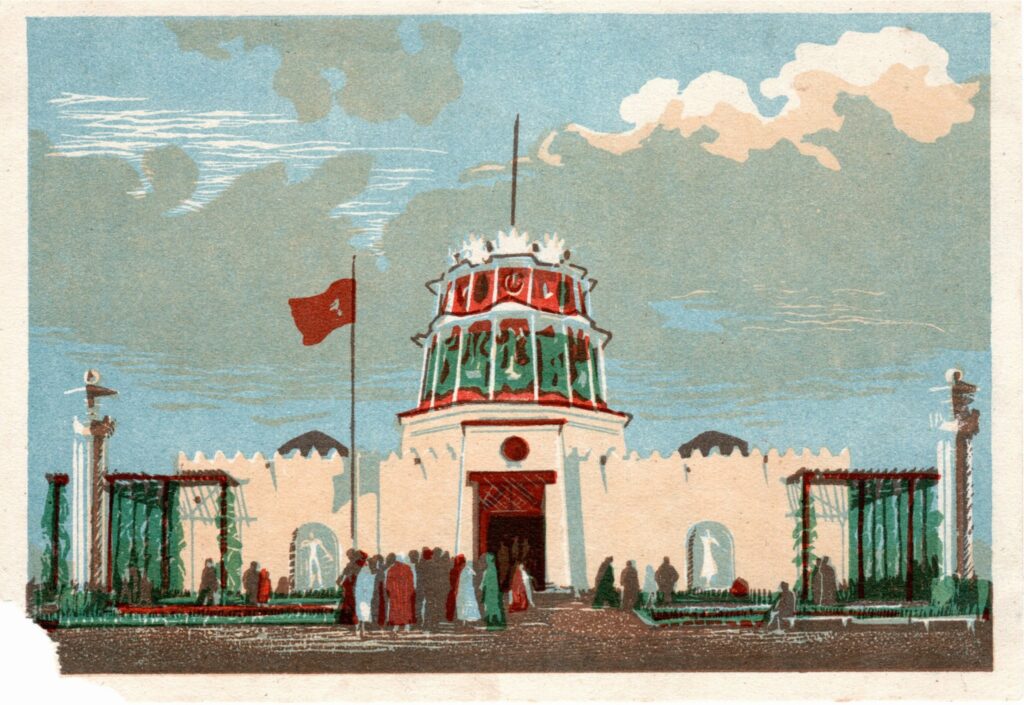Вышло так, что павильон БАССР был запечатлён в меморабилии неоднократно. Судя по оставшимся снимкам и рисункам он действительно был интересным, выделяющимся из ряда аналогичных. Одно из самых красивых его изображений осталось на вот этой открытке 1939 г. Оно выполнено в технике линогравюры замечательной советской художницей Татьяной Козулиной.