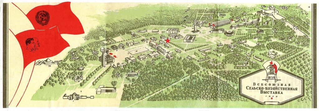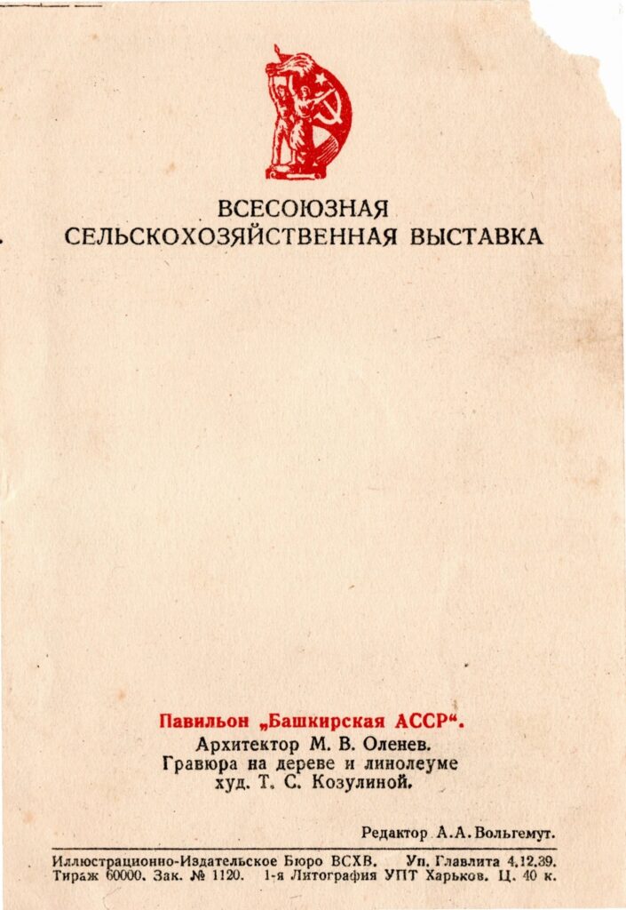 Это оборотная сторона открытки. Здесь любопытно многое. Например, то, что ВСХ Выставка, оказывается, имела целое иллюстрационно-издательское бюро. А заказы при этом печатала не в Москве или Ленинграде, а в относительно далёком Харькове. Архитектором здания указан Оленев, но только он не М.В., а Михаил Фёдорович. М.Ф. Оленев (1907-1953 гг.) – ученик знаменитого А.А. Веснина, и сам – не только архитектор-практик, но и преподаватель. В МАрхИ одним из его студентов был не кто иной, как будущий кинорежиссёр Георгий Данелия, автор «Мимино» и «Осеннего марафона». Павильон БАССР на ВСХВ (потом ВДНХ) – один из лучших реализованных проектов Оленева. Наверное, не даром он занял своё место (обозначено звёздочкой) на центральной аллее выставки.