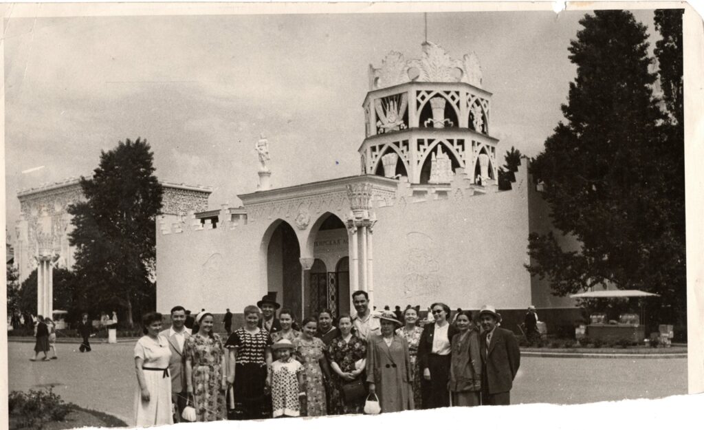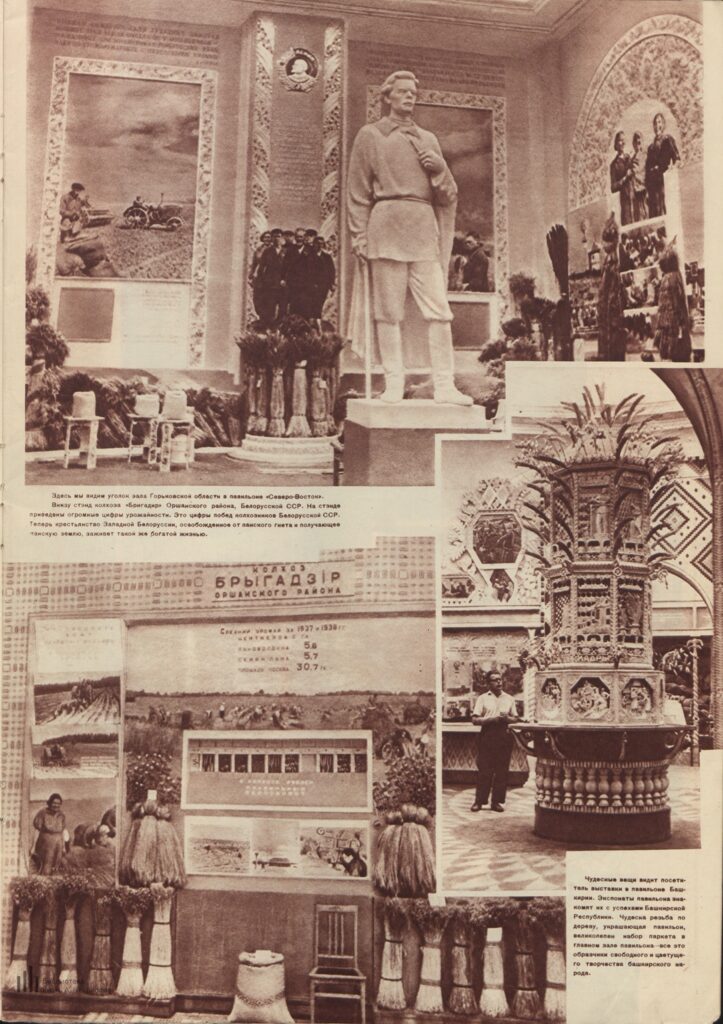 Вот так было внутри павильона. В его оформлении принимали участие многие выдающиеся художники, скульпторы, резчики, в том числе, и наш земляк, А.Э. Тюлькин. Не он ли это стоит возле центральной колонны павильона? (фото из сборника «СССР на стройке», 1939 г.).Во второй половине 50-х., уже после смерти М.Ф. Оленева, когда сменилась и сама эпоха, на ВДНХ произошла, как это помягче сказать, реконцепция. Испохабили и «наш» павильон, превратив его в нечто под названием «Кукуруза». А в 1966 г. его разобрали, уже совсем…А для меня лично павильон БАССР на ВСХВ остаётся сказочной башенкой, на фоне которой снялся на память вместе со своими товарищами мой, тогда ещё совсем не старый дедушка. Вон он, в заднем ряду, высокий, худой, улыбающийся мне из 1955 года…