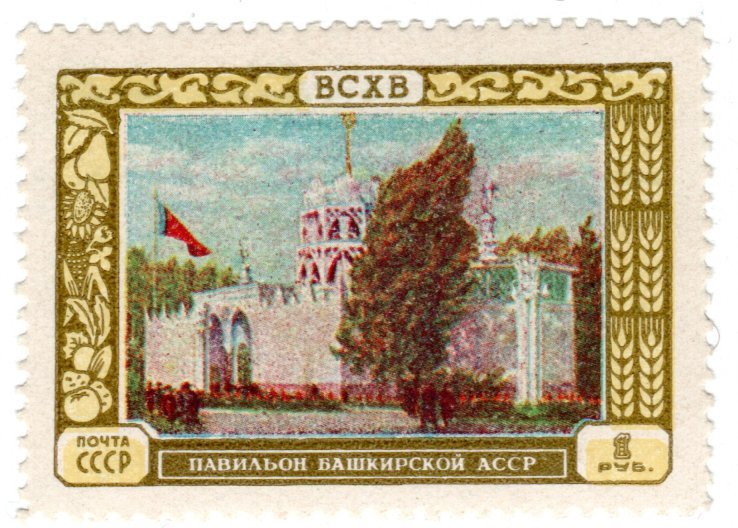 В 1954 г. в СССР была выпущена серия почтовых марок, посвящённая Всесоюзной сельскохозяйственной выставке (ВСХВ). В этой серия была и марка с изображением павильона Башкирской АССР. Павильон этот был построен незадолго до начала Великой отечественной войны и у него очень любопытная судьба.