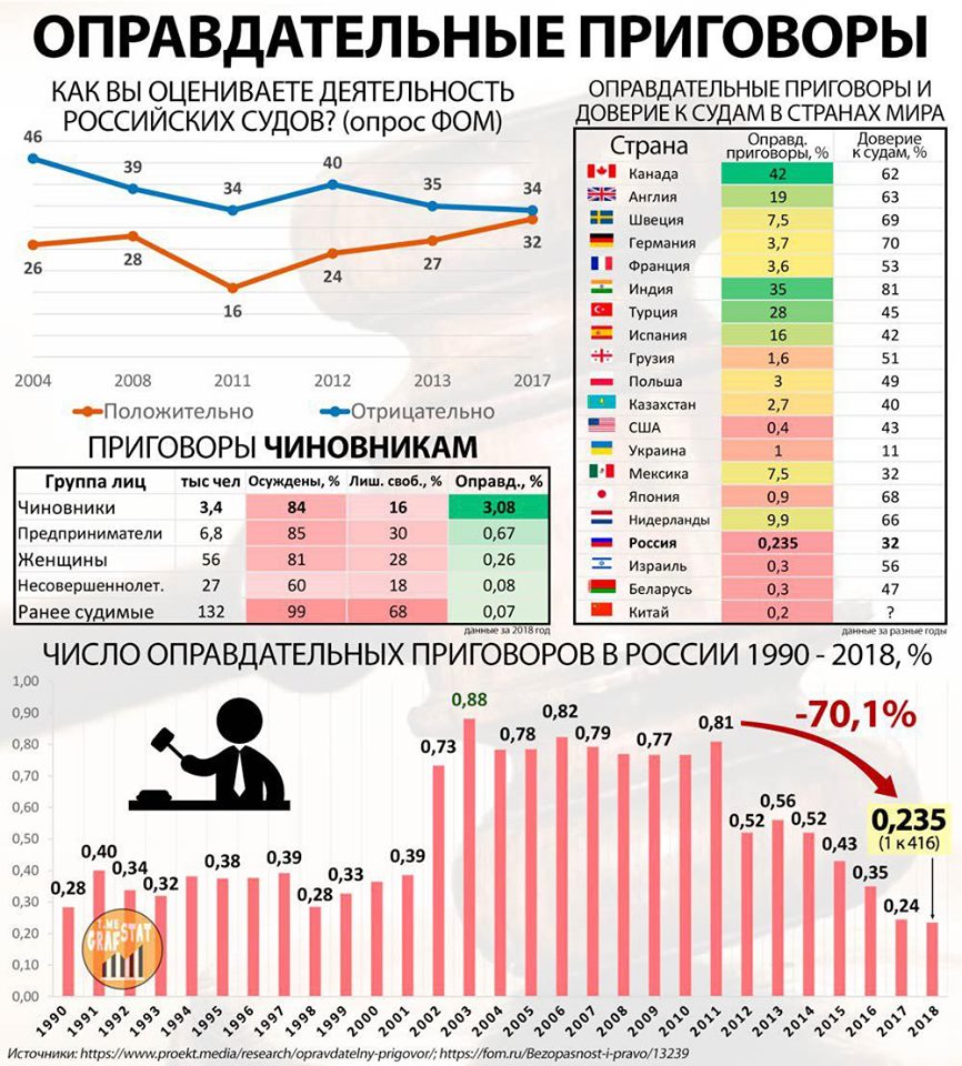 В стране с 2011 года падает число оправдательных приговоров. Рекордно низкое значение (0,239%) было достигнуто в 2017г, однако в 2018г. показатель снизился еще сильней — до 0,235%, т.е. оправдывают 1 человека из 416. Вместе с тем 32% граждан положительно оценивают деятельность российских судов.И число положительно оценивающих растет…