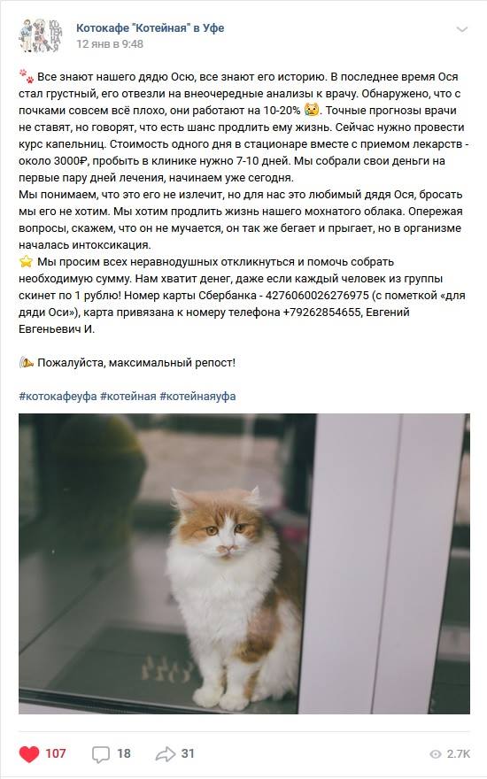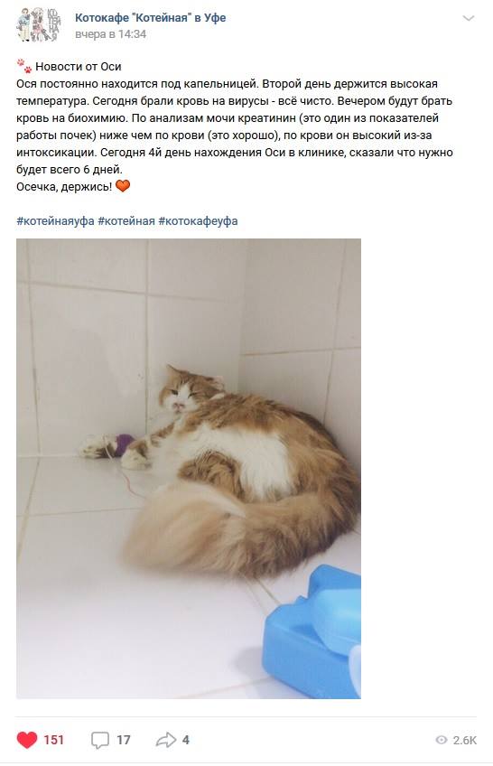 В субботу на своих страницах @catcafeufa написали, что у Оси с почками совсем плохо, и врачи не дают прогнозов. Владельцы и сотрудники собрали свои деньги и не собираются отказываться от шанса продлить ему жизнь. Один день в клинике под капельницами стоит 3 тысячи. Кафе объявило скромный сбор средств.