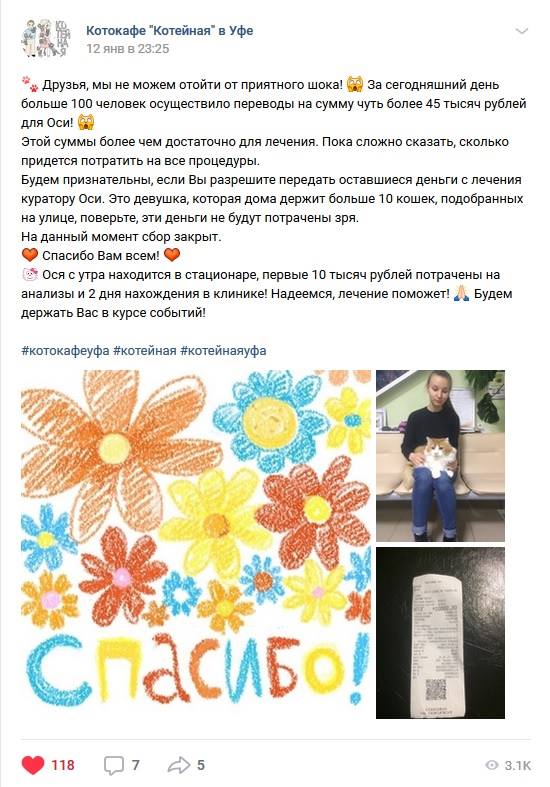 Спустя 14 часов шокированные владельцы разместили новый пост и попросили больше не переводить денег. Полдня, больше 100 человек, больше 45 тысяч рублей. Хватило Осе на полный курс лечения и еще осталось, чтобы передать куратору 10 других кошек.