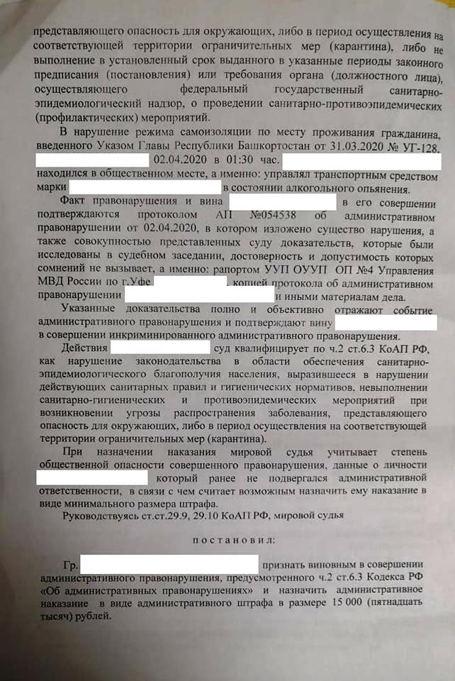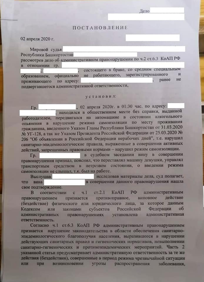 Вчера многие уфимские СМИ сообщили, что в Уфе вынесено одно из первых в стране постановлений о привлечении к ответственности лица, нарушившего запрет на передвижение по городу в условиях эпидемии. Копию постановления выкладываю.