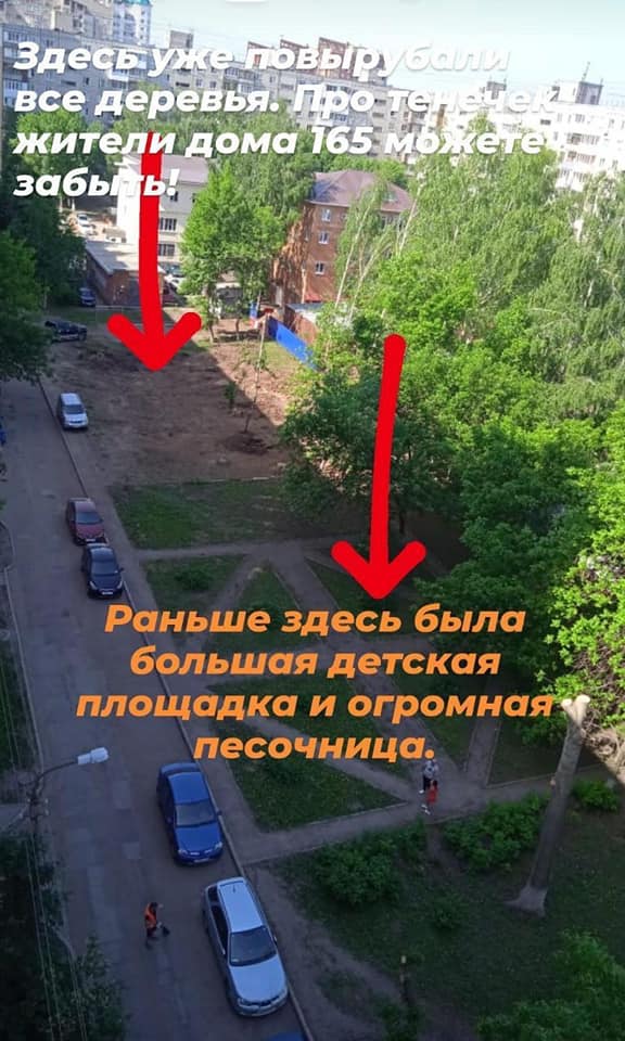 Мы, жители против такого вандализма! Согласно программы «Башкирский дворик», до и после подписания документов жильцы должны быть ознакомлены с планом благоустройства и приняты все согласования по программе. Ничего этого не было!!! Полный беспредел! Что это за благоустройство, когда уничтожаются здоровые взрослые деревья?!»