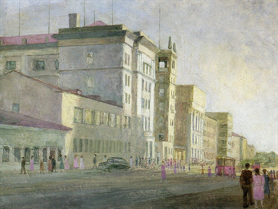 Василий Сыромятников. Улица Ленина. 1951 г. к.,м. 26,2х34 (Национальный музей РБ). Помню эти здания.Еще не было к/т «Родина» .