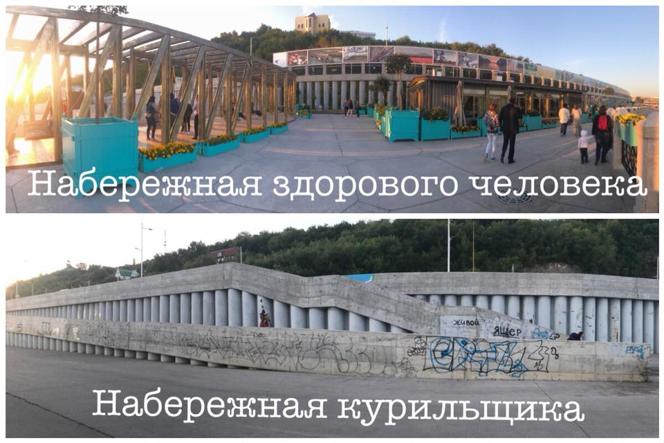 Правая сторона набережной совсем иная))) это явно набережная курильщика) сразу на въезде традиционные летние шатры с шашлыком и пивом из 90х, серый неаккуратный бетон, кривые граффити и «здесь был Вася», куча осколков бутылок, бычки сигарет и уголь от кальянов. Публика соответствующая) Вообще эта сторона набережной как будто одна большая кальянная. Все приезжают сюда на машинах именно за этим. Ну и побухать. Можно на въезде даже арендовать кальян