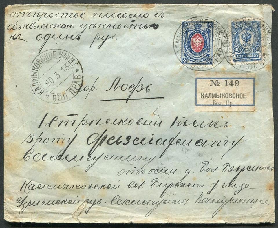 Конверт (чехол) денежного письма из Бирского уезда в Царство Польское 1913 года. Самое здесь примечательное — это штемпель Калмыковского волостного правления. Гашения волостных правлений встречаются очень редко, собственно, вижу подобное второй раз в жизни, до того встречал штамп Учалинско-Тептярской волости.