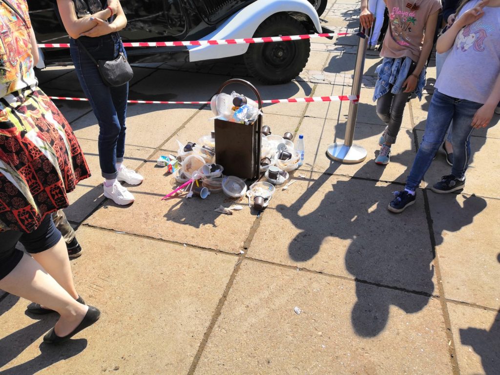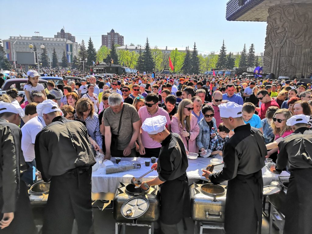 3 бутылки уже в пакете, через несколько секунд произойдет дерзкий побег, который закончится смачным пинком. Видео есть чуть ниже на стене, если кто-то еще не видел. Немного незаконной торговли, без товарных чеков, регистрации и смс. Флаги по 200, значки по 150. Слева виднеется сцена, а это палатка для переодевания артистов. Общая, для мужчин и женщин. Гендерное равенство в действии. Более того, скрывать нам нечего, поэтому полуголые тела доступны для обозрения всех гуляющих. А вот так вбивали колышки, чтобы палатка держалась. Ломать не строить, правда? Это правда было настолько необходимо? А это мой лидер в списке жести) В день Победы, в день, когда война наконец-то закончилась, в центре Горсовета стоит палатка с агитацией на военную службу по контракту. Можно записаться прямо тут и спустя какое-то время отправиться нести добро и справедливость с автоматом, в какую-нибудь жаркую точку на нашем глобусе. День Победы. Меня искренне радует, что это место не пользовалось большой популярностью у гостей праздника Полевая кухня, настоящая. Наверное, может и нет, я без понятия. Очередь за бесплатной кашей, до горизонта. Разумеется, это не так, но смотрится эпично) Люди способны сделать помойку в любой точке города. Урна переполнена, может поищем другую? Да неееет, положим рядом. При достаточном количестве времени и недальновидных человечков, мусор будет разрастаться, сначала он накроет урну и мы забудем, с чего все началось, а дальше начнем собираться по вечерам вокруг свалки и танцевать голыми у разожженных костров, а на вершину кучи присобачим символ, которому будем поклоняться. Голову свиньи, например. Чай и каша. Чай листовой, сладкий, почти густой. Каша с редкими вкраплениями мяса, но тоже весьма вкусная. Время проведенное в очереди на солнцепеке — 25 минут. Дедушке стало плохо, его посадили на стул, тут же вынесли из толпы в тень, оказали помощь. Отличная работа, без сарказма. Те самые фотографии раздора. Через минуту придет мужик с камерой и начнется.