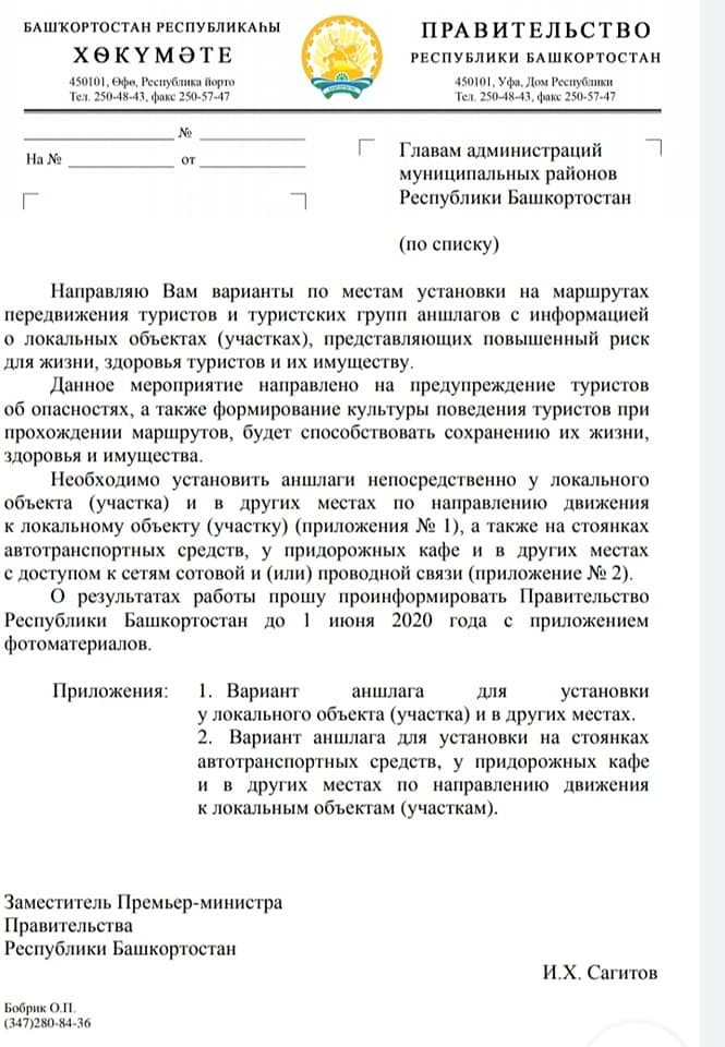 Вы же знаете, что в Башкирии нет навигации по достопримечательностям и локациям. Ни одной таблички за пределами Уфы! Еще раз, в нашей обожаемой, прекрасной, второй Швейцарии, оплоте бортничества, нет навигации! У нас даже индейцы есть прости господи, а навигации нет!! Что-то кто-то где-то ставит своими силами, но нет общей, сквозной, дублирующей, унифицированной, общемировых стандартов. Это настолько простая вещь, это же такая фигня – сделать таблички, но даже это мы обсуждаем годами и нихрена не делаем. Ну ок, лед вроде тронулся и даже нас приглашали к Римма Бойцова, тогда еще туризм был с предпринимательством. И мы с Олег Чегодаев Артур Идельбаев правили эти блин файлы, вносили свои дополнения где и как ставить таблички, ну все же просто. И вот! Я вас поздравляю!! Вышло поручение правительства установить таблички! Но, ска, запрещающие!!! Предупреждающие об опасности!! К объекту табличек нет, но вдруг вам повезет и вы доедете, а там мы блин о вас позаботились! Нет, не лавочка! Нет, не мусорка! Нет, не информационный аншлаг, а Внимание!! Опасность!! Туризм в Башкирии это опасно!! Башкирия, где понятие туристическая инфраструктура начинается с запрещающих табличек!