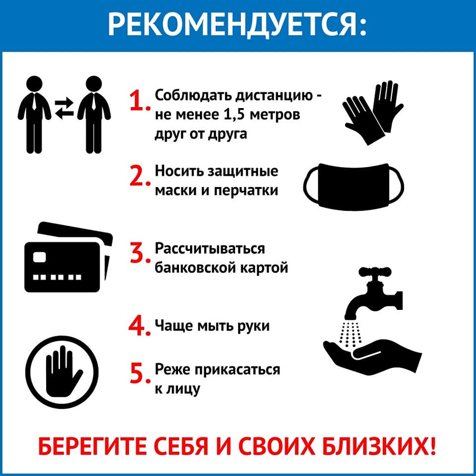 Во всех общественных местах (магазинах, аптеках, транспорте, за исключением такси) обязательно соблюдайте дистанцию — не менее 1,5 метров друг от друга. Носите защитные маски и перчатки. Мойте руки и снимайте верхнюю одежду по возвращению домой. Эти простые меры помогут избежать возможного заражения. Кроме того, прекращается автобусное сообщение с другими регионами, а внутри Башкортостана-ограничивается количество рейсов.