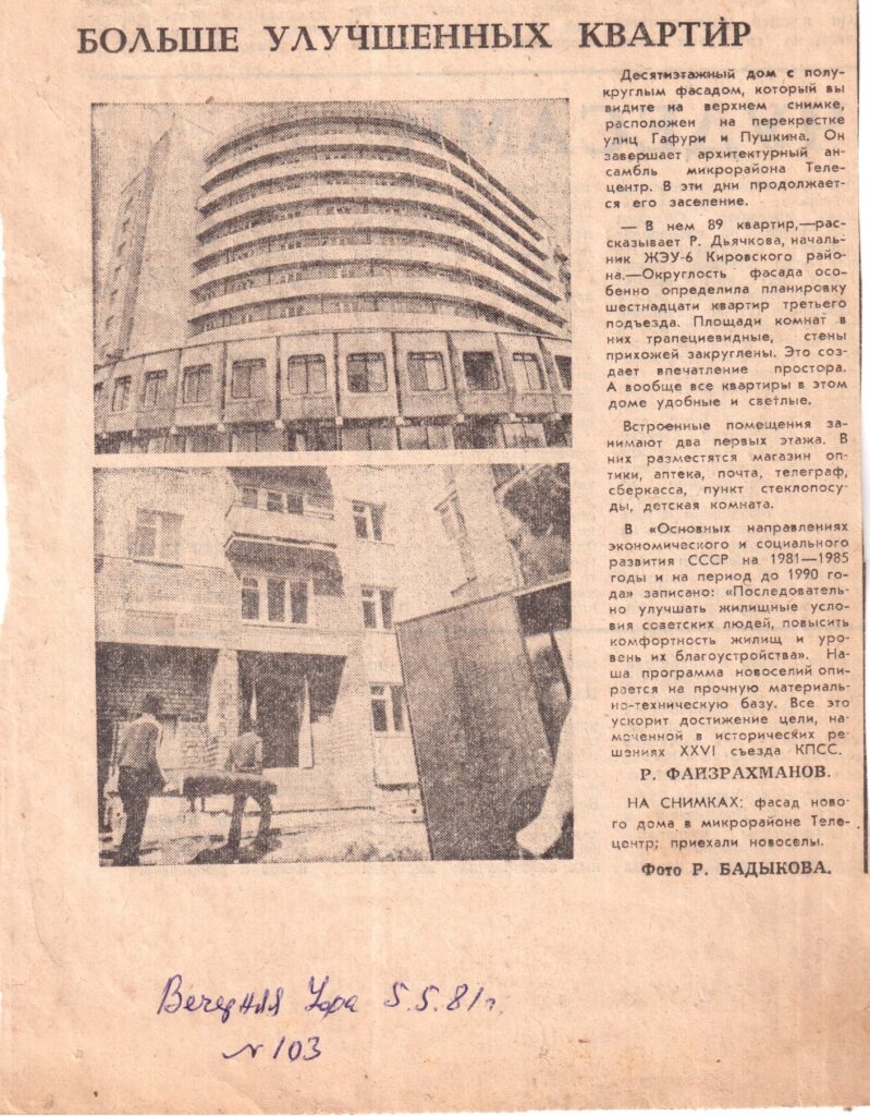 «Десятиэтажный дом с полукруглым фасадом, который вы видите на верхнем снимке. расположен на перекрестке улиц Гафури и Пушкина. Он завершает архитектурный ансамбль микрорайона телецентр. В эти дни продолжается его заселение.