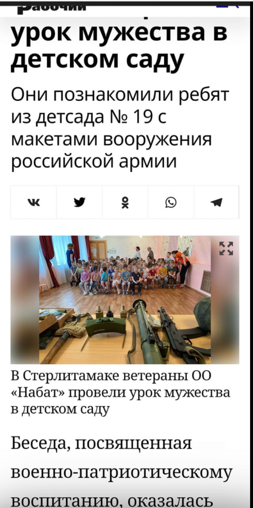 Оружие их особо не интересовало, хотя в наличии имелись всякие игрушки. Им больше нравилось созидательное Лего. Всякие прятки-бегалки тоже все были с мирной тематикой. И не было у них в игре четкого деления на «наши» и «не наши». Потому что образ «не наших» не был конкретизирован, как у нас в детстве.Интересно, во что будет играть новое поколение детей. Думаю, неизбежно возрастёт интерес к военной тематике, раз она теперь всюду, даже в детском саду. У кого дети маленькие, что там происходит у них сейчас, расскажите.Фото из детского сада, где недавно проходил урок мужества. Военные приходили, рассказывали о своей деятельности.