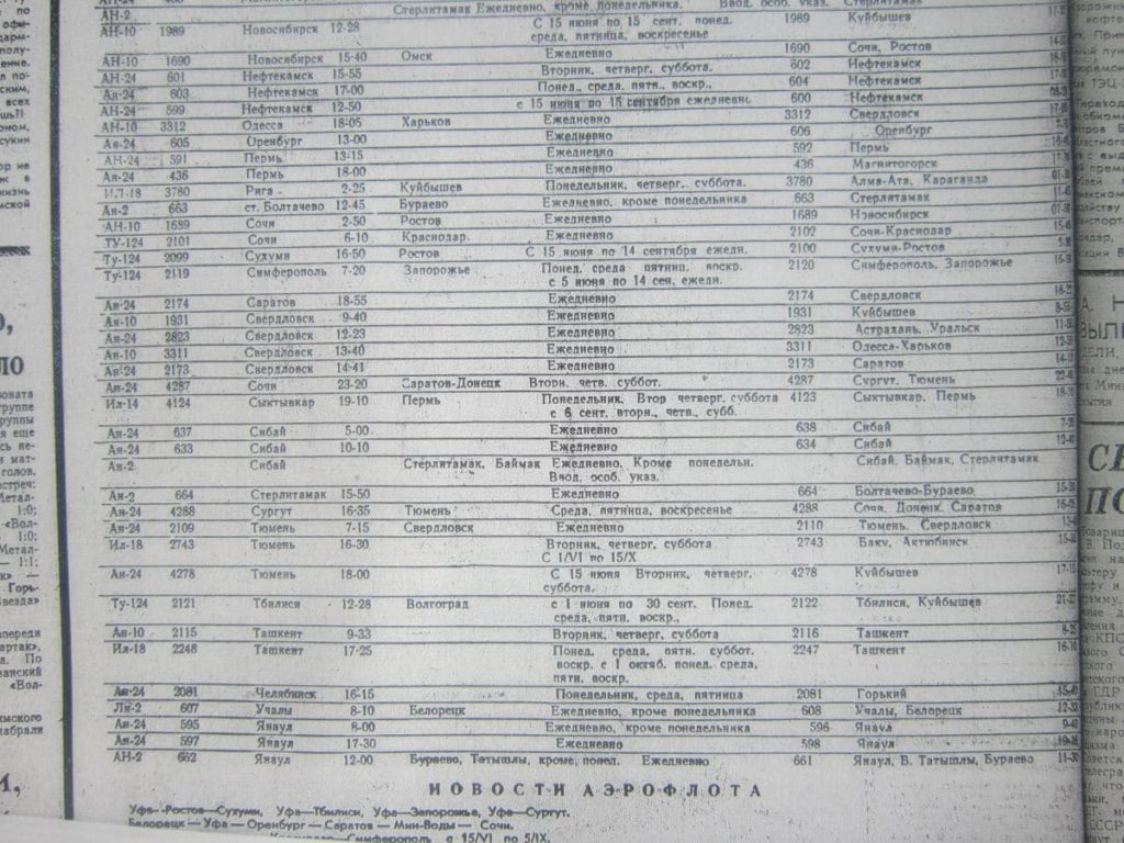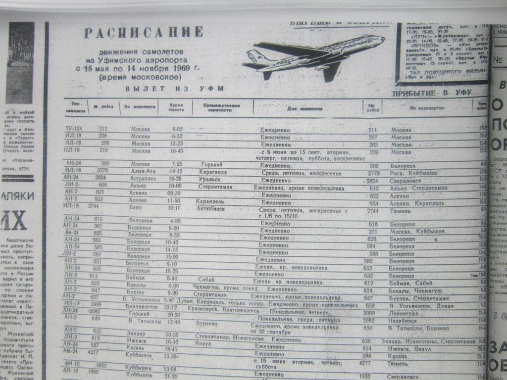 А вы загляните тепеть в расписание аэропорта «Уфа», ещё не международного, с маленькой полосой, без рукавов ThyssenKrupp и (даже, трудно себе представить, без Tanya Rizvan! ) — в летнее расписание — с 15 мая по 14 ноября 1969 года.