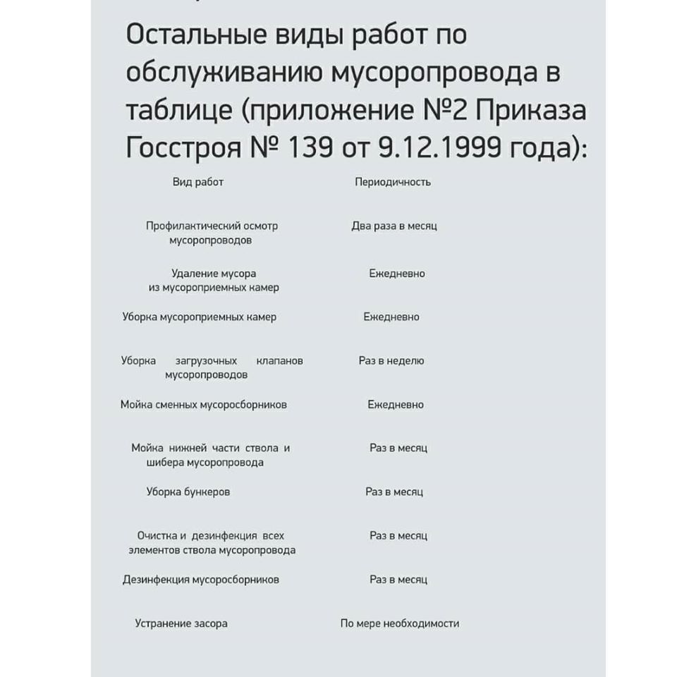 УО должна обслуживать мусоропроводы (пункты 3.2.1, 5.9.10 «Правил и норм технической эксплуатации жилищного фонда», утверженных Постановлением Госстроя РФ от 27.09.2003 года № 170). Загрузочные клапаны должны содержаться в чистоте и промываться минимум один раз в месяц (пункт 5.9.19 «Правил и норм технической эксплуатации жилищного фонда», утверженных Постановлением Госстроя РФ от 27.09.2003 года № 170). Неисправности мусоропроводов должны устраняться в течение суток (приложение №2 «Правил и норм технической эксплуатации жилищного фонда», утверженных Постановлением Госстроя РФ от 27.09.2003 года № 170). Остальные виды работ по обслуживанию мусоропровода в таблице (приложение №2 Приказа Госстроя № 139 от 9.12.1999 года) (в карусели). Кто отвечает: Управляющая организация. Что делать: