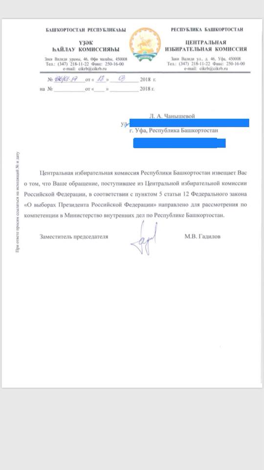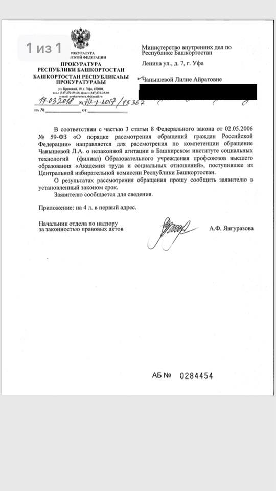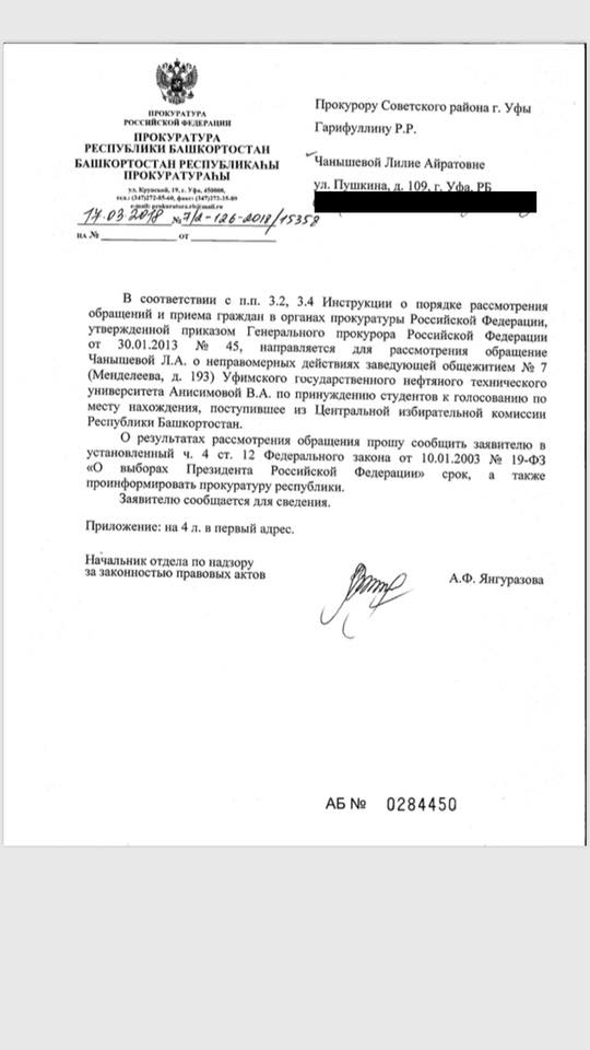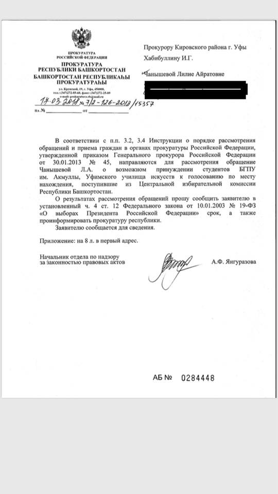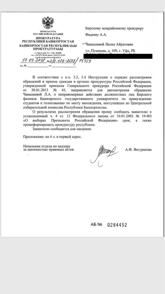 Жалобы на принуждение к голосованию в УГНТУ, БГПУ, Училище искусств, Бирском филиале БГУ и незаконную агитацию в БИСТ ЦИК отправил в МВД РБ. Параллельно пришли уведомления от Прокуратуры РБ о перенаправлении моих жалоб в районные прокуратуры.