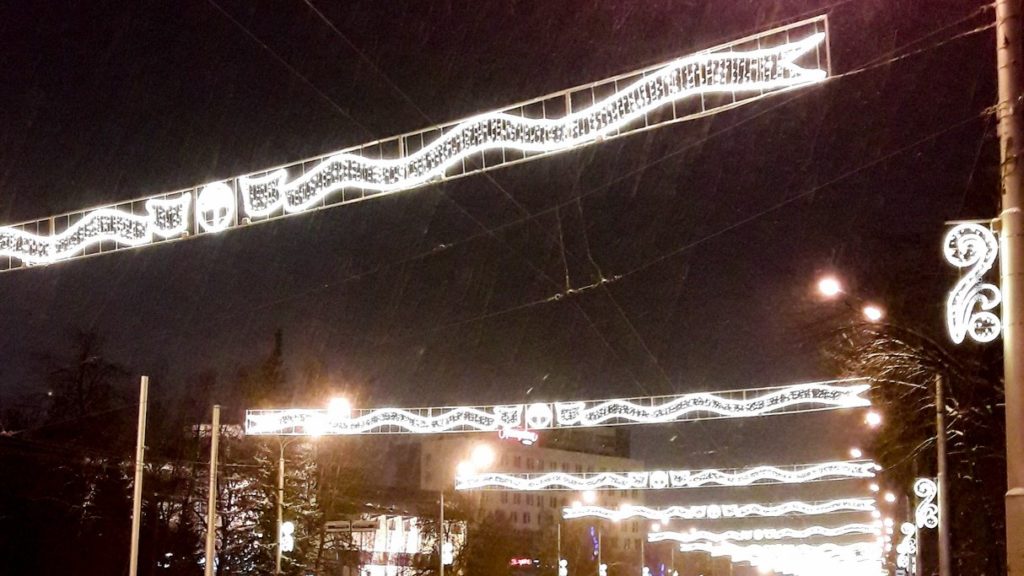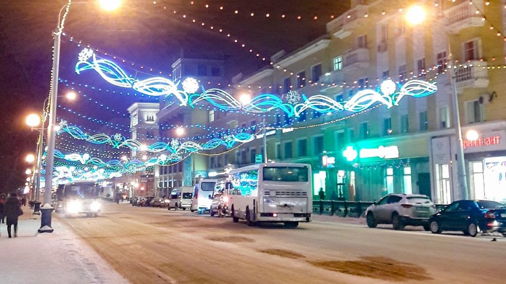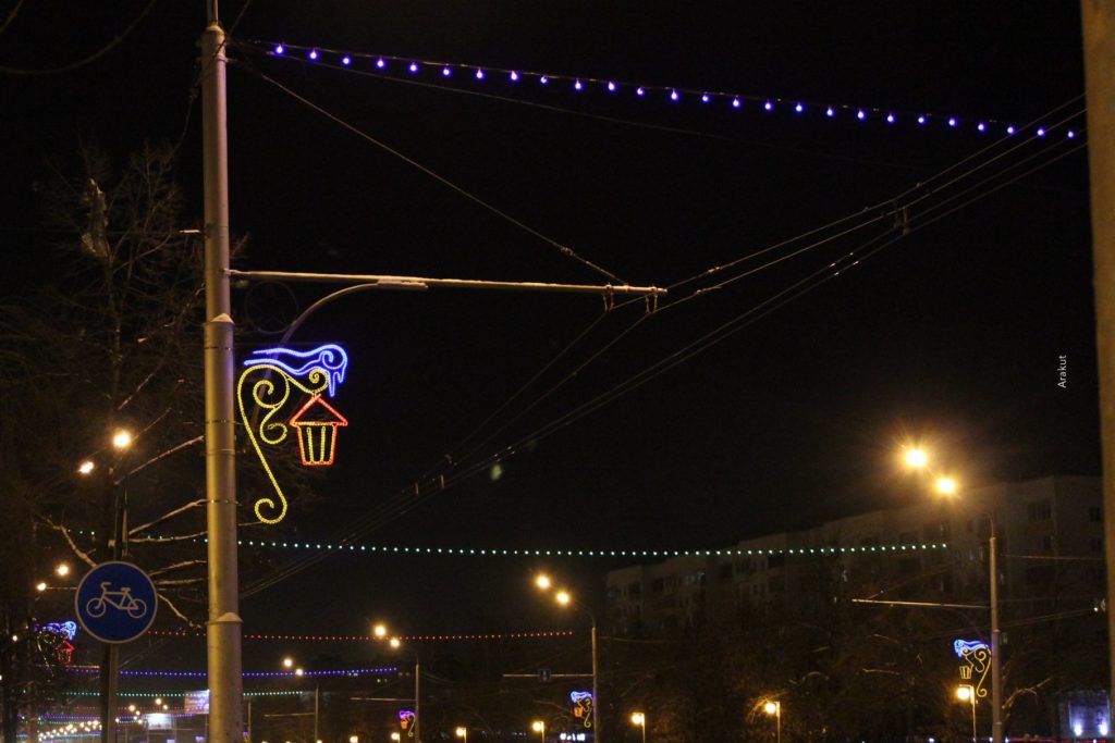 На второй фотографии улица 50-летия Октября. Тут все становится чуть скромнее, лампочек уже поменьше, но по прежнему — отличное новогоднее украшение! Вы только посмотрите, как здорово тянутся вдаль эти яркие светлые стяги.