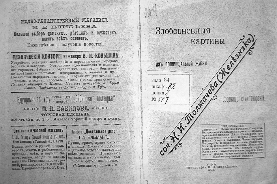Стихотворения Николая Ивановича Толмачева из сборника «Злободневныя картины из провинциальной жизни», изданного в Уфе в 1903 году.